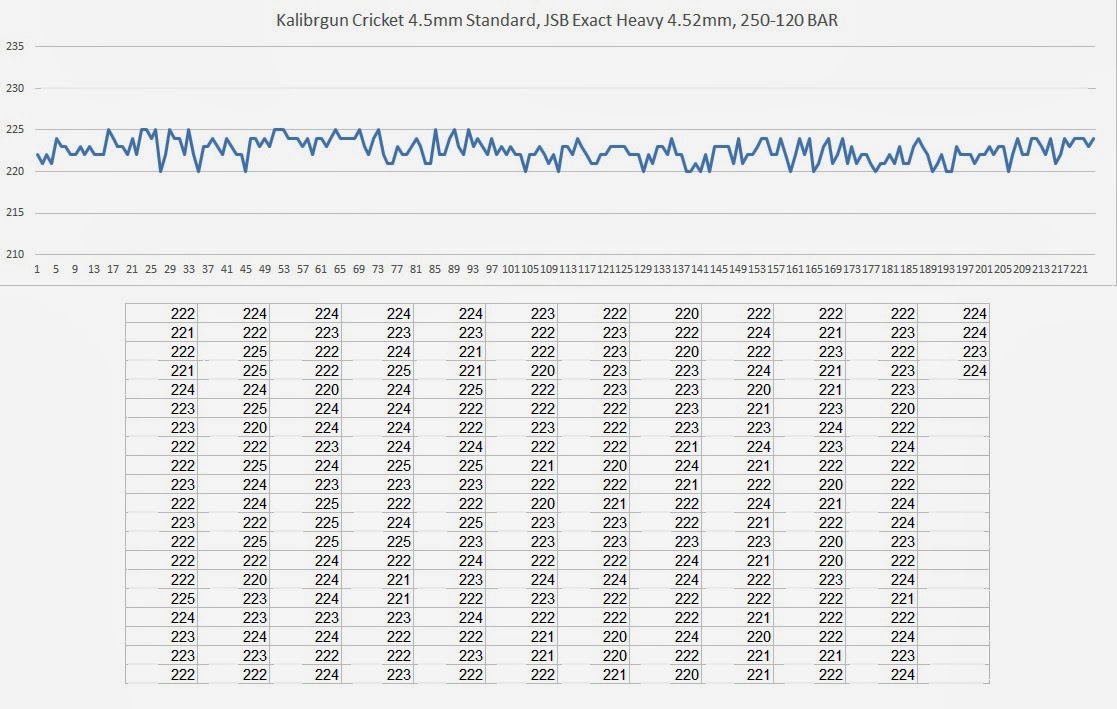 Regulator ustawiony jest na 120 BAR, co przy załadowaniu kartusza do 250 BAR /kartusz 300 BAR/ daje na około 125 stabilnych strzałów. Poniżej wykres dla JSB Heavy 4.52mm